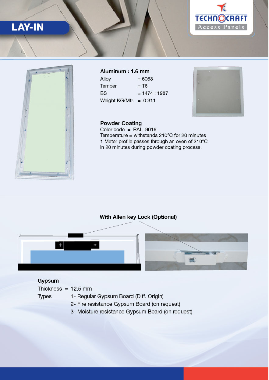 Technocraft Interiors produces different types of ceiling Access Panels with the combination of Powder Coated Extruded Aluminium and Gypsum Board with special push to open system and hinges. We can also manufacture and supply the Access Panels with Fire Resistant and Moisture Resistant Gypsum Board if required. The standard colour of Aluminium frame used is Access Panel is RAL 9010, but can aslo arrange any colour if required.